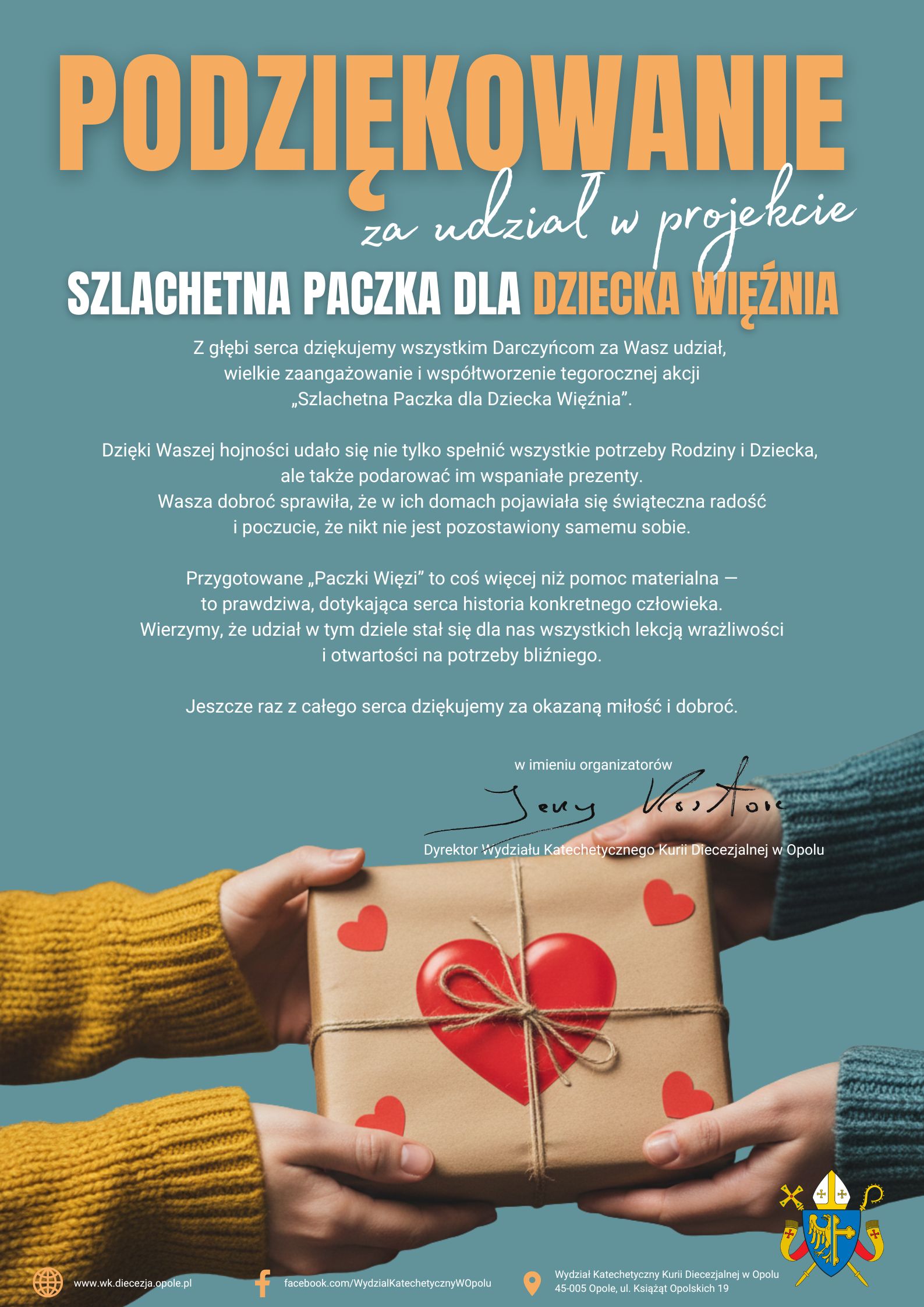 Z wyrazami głębokiej wdzięczności pragniemy podziękować wszystkim Darczyńcom za udział, zaangażowanie oraz współtworzenie tegorocznej edycji akcji „Szlachetna Paczka dla Dziecka Więźnia”.