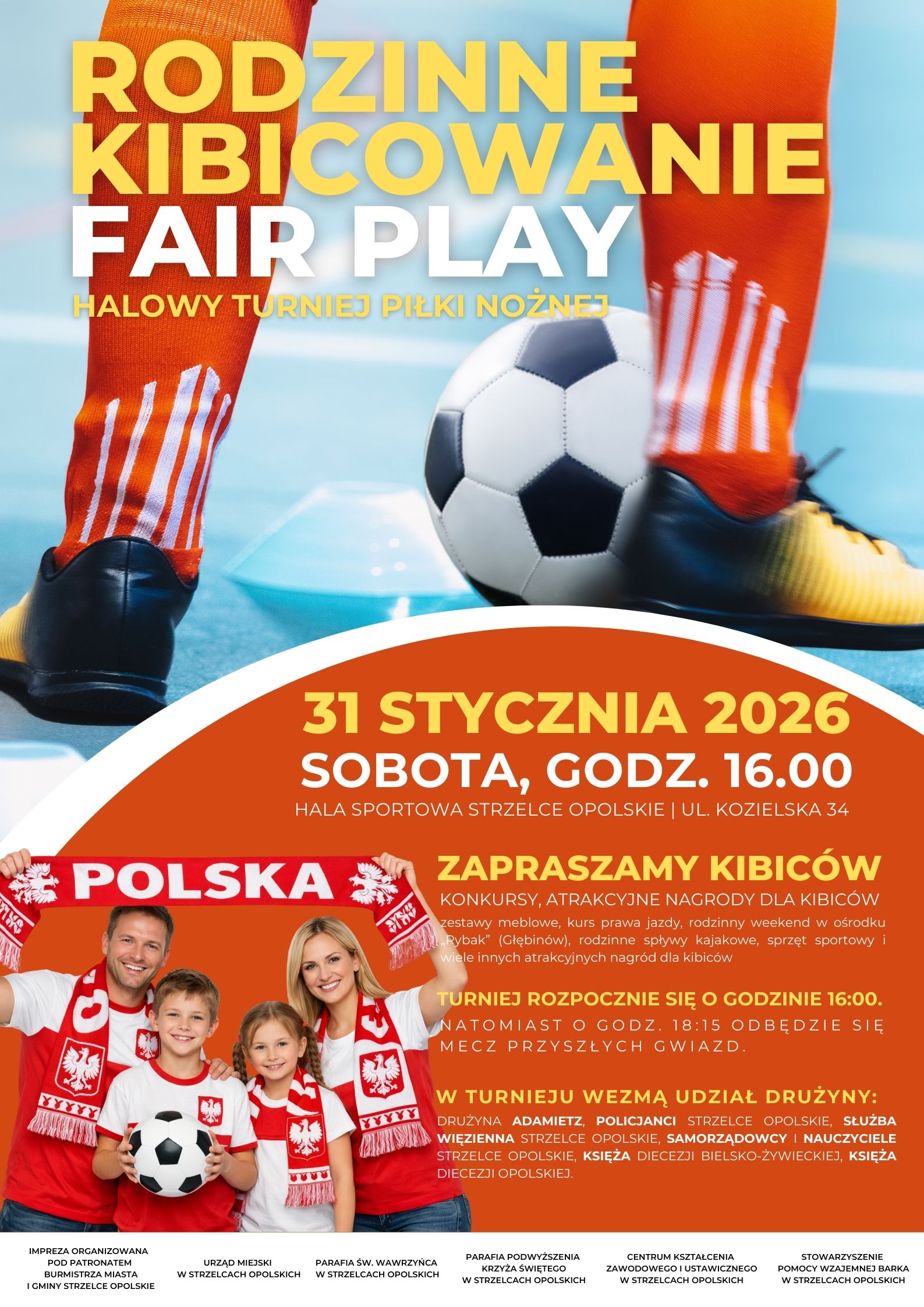 W sobotę 31 stycznia 2026 roku od godz. 16.00 w Hali Sportowej przy ul. Kozielskiej 34 w Strzelcach Opolskich zostanie rozegrany Halowy Turniej Piłkarski pod hasłem: „RODZINNE KIBICOWANIE FAIR PLAY”.