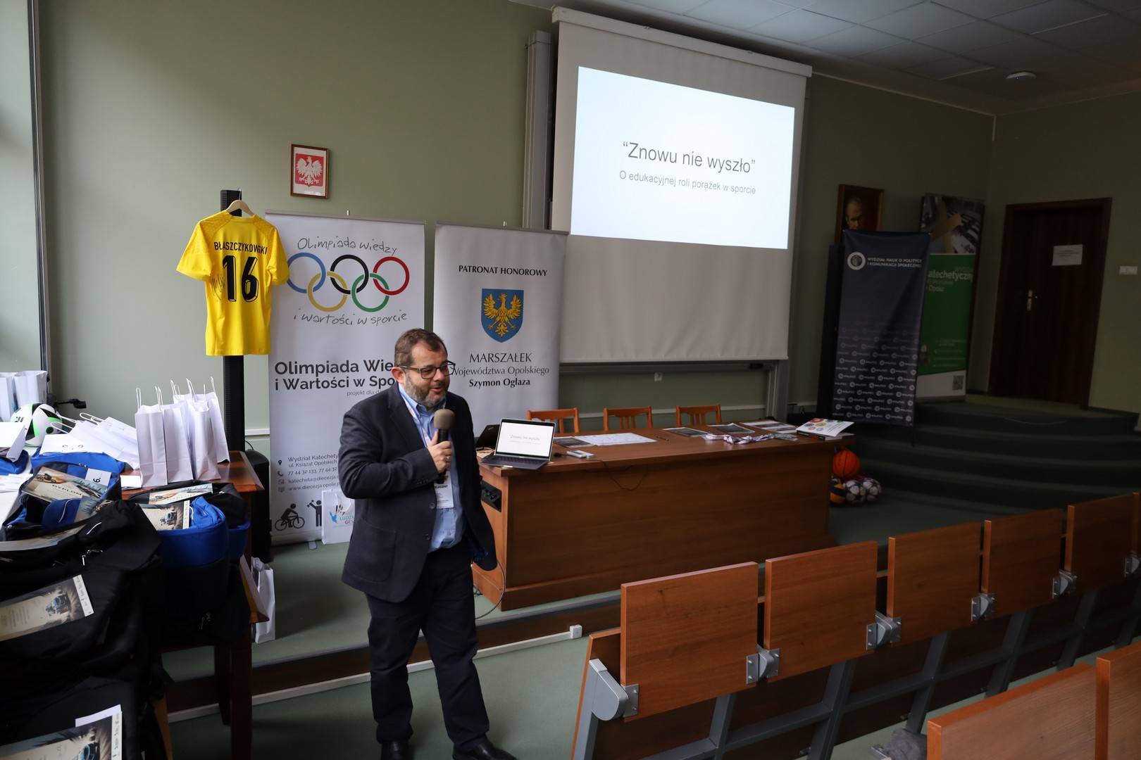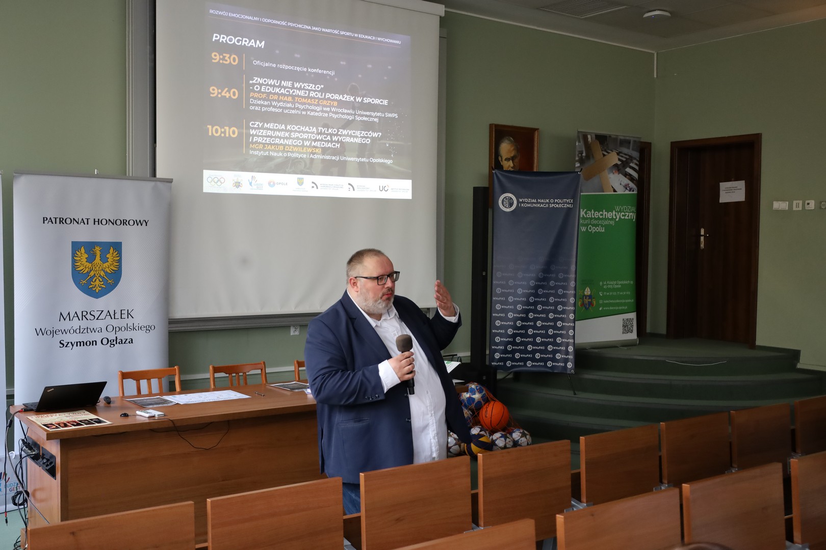 Kolejny z prelegentów, dziennikarz Jakub Dźwilewski (Instytut Nauk o Polityce i Administracji UO) w wystąpieniu „Czy media kochają tylko zwycięzców? Wizerunek sportowca wygranego i przegranego w mediach” przedstawił analizę medialnych obrazów sportowców. Zwrócił uwagę, że choć media najchętniej eksponują zwycięzców, to coraz częściej pojawiają się narracje doceniające wysiłek, wytrwałość oraz etyczną postawę zawodnika, niezależnie od wyniku. Prelegent ukazał, jak przekaz medialny może wpływać na postrzeganie porażki. Podkreślił też różny wpływ różnych mediów na kreowanie tego obrazu – w mediach tradycyjnych kontakt sportowca z odbiorcą dokonuje za pośrednictwem przekazu medialnego, w przypadku mediów społecznościowych – sportowiec sam może kreować swój wizerunek medialny.