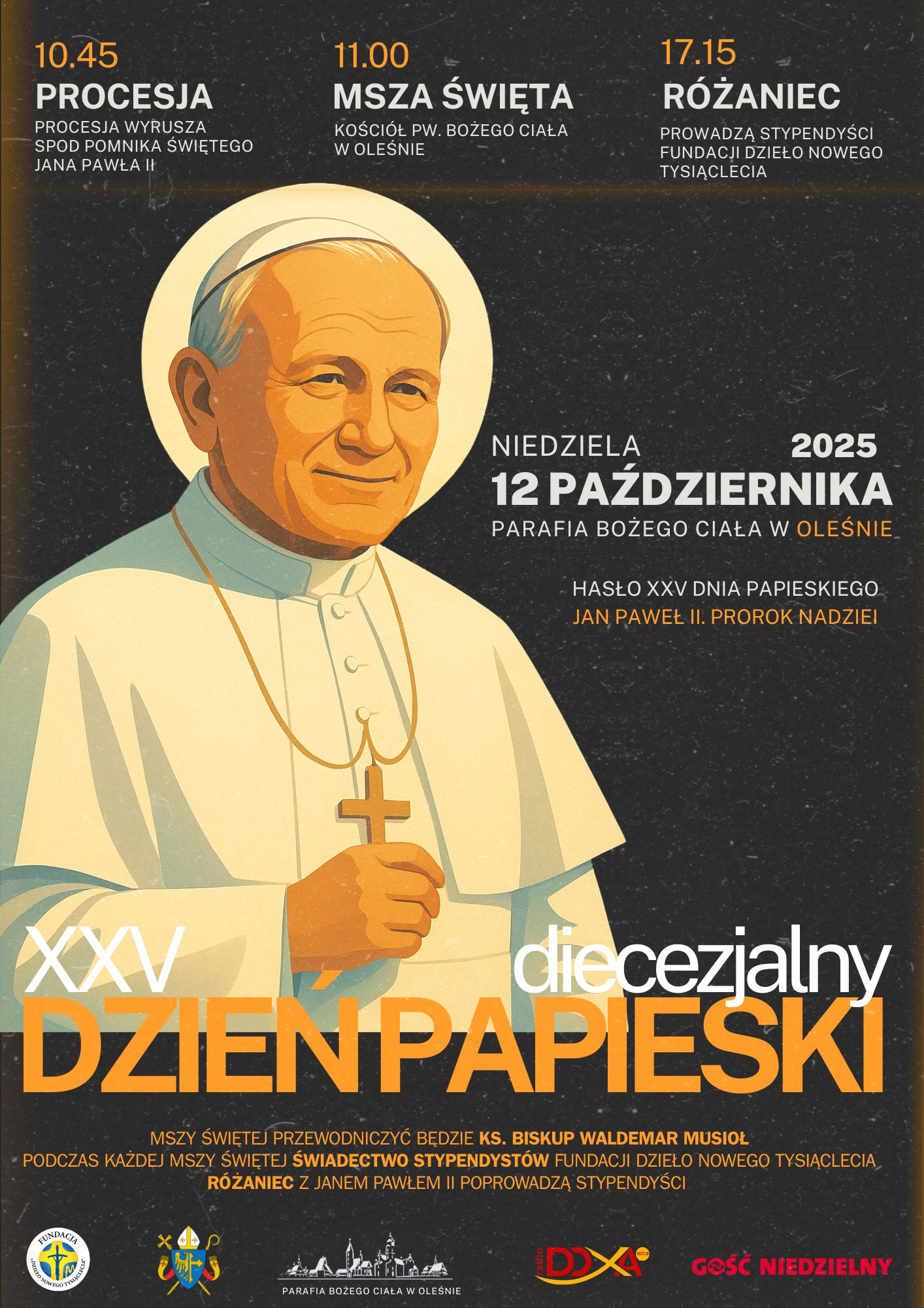 Diecezjalne obchody XXV Dnia Papieskiego odbędą się w Niedzielę, 12 października 2025 r., w Oleśnie, w parafii Bożego Ciała.