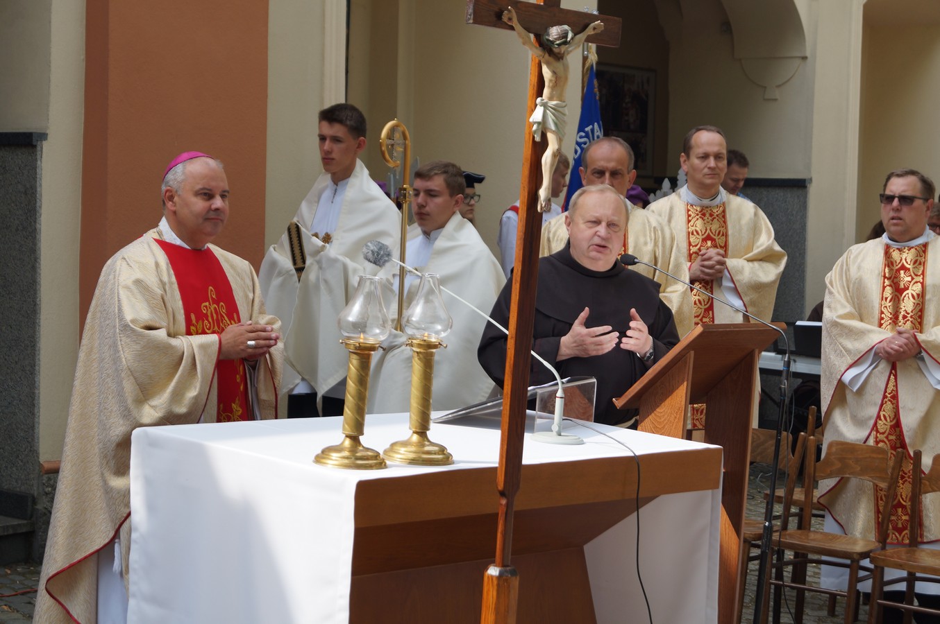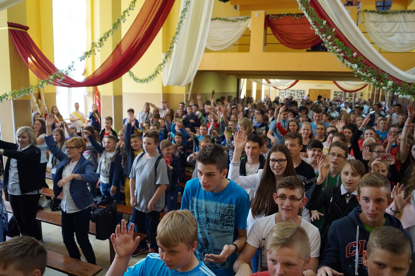 Uroczystej Mszy św. na Rajskim Placu przewodniczył ks. Biskup Rudolf Pierskała. W swojej homilii Biskup Rudolf nawiązał do zbliżających się Światowych Dni Młodzieży i zaapelował, by również szkoły im. Jana Pawła II dołożyły starań, by stawać się gościnnym domem dla wszystkich, którzy w nich przebywają. „Kiedy wzajemna miłość jest między mieszkańcami domu, w rodzinie, wtedy rzeczywiście staje się gościnny. Kiedy wzajemna miłość jest w szkole między nauczycielami, uczniami, dyrekcją, pracownikami - to też jest możliwe, aby szkoła stała się takim gościnnym domem. To jest możliwe, kiedy przeniesiemy te relacje domowe do szkoły.” Zaś w kontekście trwającego w Kościele Roku Miłosierdzia, ks. Biskup postawił zebranym pytanie: „Czy szkoła może być bramą miłosierdzia? […] Co mamy czynić, żeby stać się miłosiernymi, żeby taka brama w szkole była?” Odpowiadając na to pytanie, przywołał słowa Pana Jezusa, który nas uczy: „Nie sądźcie, a nie będziecie sądzeni; nie potępiajcie, nie będziecie potępieni; odpuszczajcie, a będzie wam odpuszczone. Dawajcie, a będzie wam dane, bo odmierzą wam bowiem taką miarą, jaką wy mierzycie. A nie sądzić i nie potępiać znaczy najpierw dostrzec dobro. Dostrzec dobro w uczniach, w każdej osobie, w wychowawcy, w nauczycielu, i to docenić, i to pokazać. Łatwiej jest krytykować, niż pochwalić. My mamy być narzędziami miłosierdzia w szkole, mamy być szczodrzy i pełni czułości dla wszystkich.”
