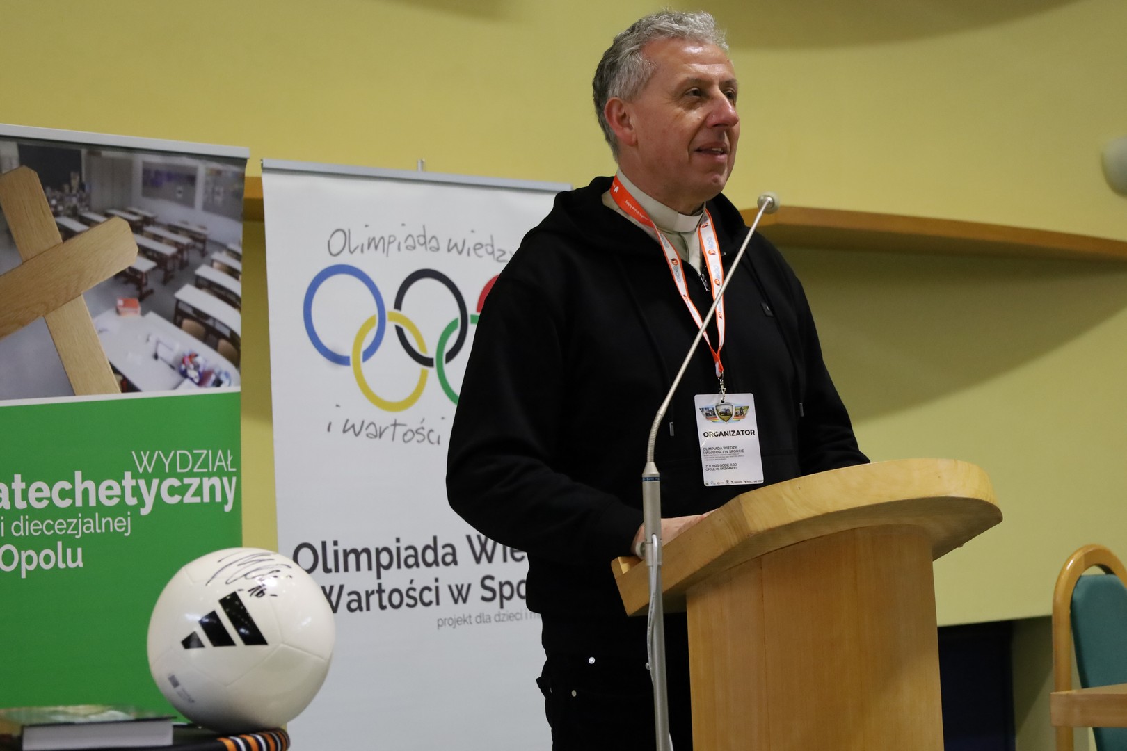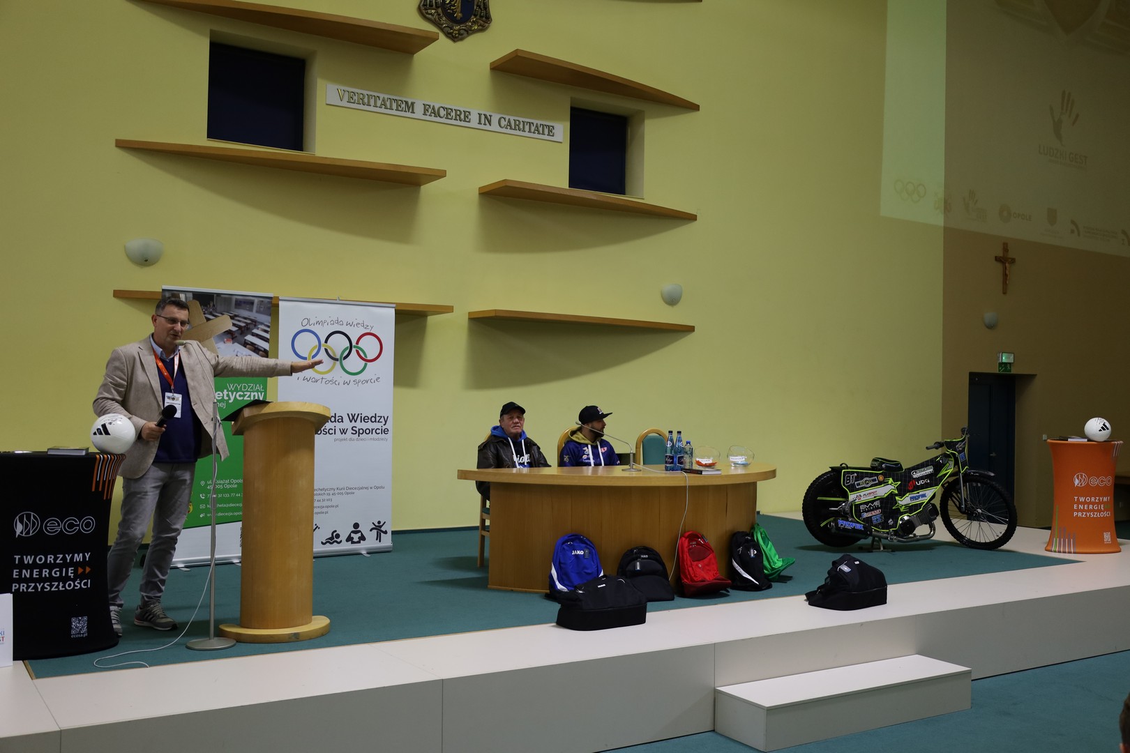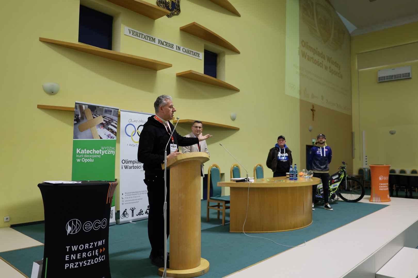 Pierwsza część finału polegała na rozwiązaniu wymagającego testu wiedzy, który sprawdzał znajomość historii sportu, jego wartości, zasad fair play, a także życia i duchowego przesłania świętych patronów młodzieży i sportowców. Pytania dotyczyły również inspirujących postaci sportowych oraz refleksji papieży – w tym św. Jana Pawła II, Benedykta XVI czy papieża Franciszka – którzy wielokrotnie podkreślali wychowawczą, społeczną i duchową rolę sportu. Po części konkursowej uczestnicy wzięli udział w spotkaniu z wyjątkowymi gośćmi – żużlowcami Wojciechem Załuskim i Oskarem Polisem. Wojciech Załuski, legenda Kolejarza Opole i wychowawca młodych zawodników, opowiadał o swojej karierze, pokonywaniu trudności oraz o tym, jak sport kształtuje wytrwałość i odpowiedzialność. Oskar Polis, mistrz Polski juniorów, dzielił się doświadczeniem młodego sportowca, dla którego pasja i samodyscyplina stały się drogą do sukcesów. Obaj goście podkreślali, że wartości obecne w sporcie – determinacja, szacunek, pokora i praca nad sobą – są równie ważne w codziennym życiu.